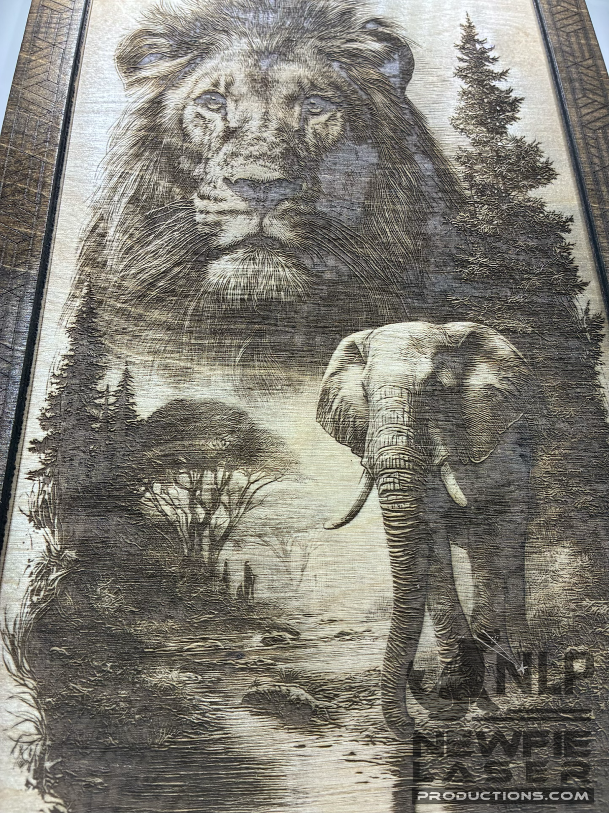 DEEP LASER ENGRAVE LION & ELEPHANT PROCESSED ON PAINTED TILE MOUNTED TO PINE BOARD FOR BACKING INCLUDES STAIN FRAME & STAND 11x14DEEP LASER ENGRAVE LION & ELEPHANT PROCESSED ON PAINTED TILE MOUNTED TO PINE BOARD FOR BACKING INCLUDES STAIN FRAME & STAND 11x14